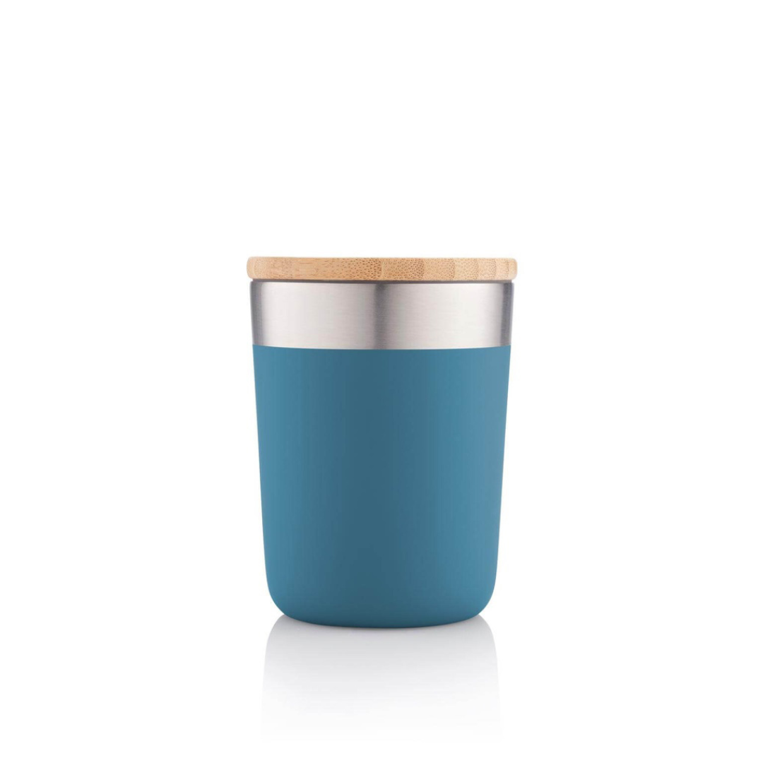 A 300 ml insulated stainless steel mug finished in a stylish blue colour, featuring a BPA-free bamboo lid for an eco-friendly look and feel. Designed with double-wall insulation to keep beverages hot or cold, this mug is perfect for use at home, work, in travel or as a gift. The compact size and durable build make it suitable for everyday use as well as event giveaways and corporate merchandise.