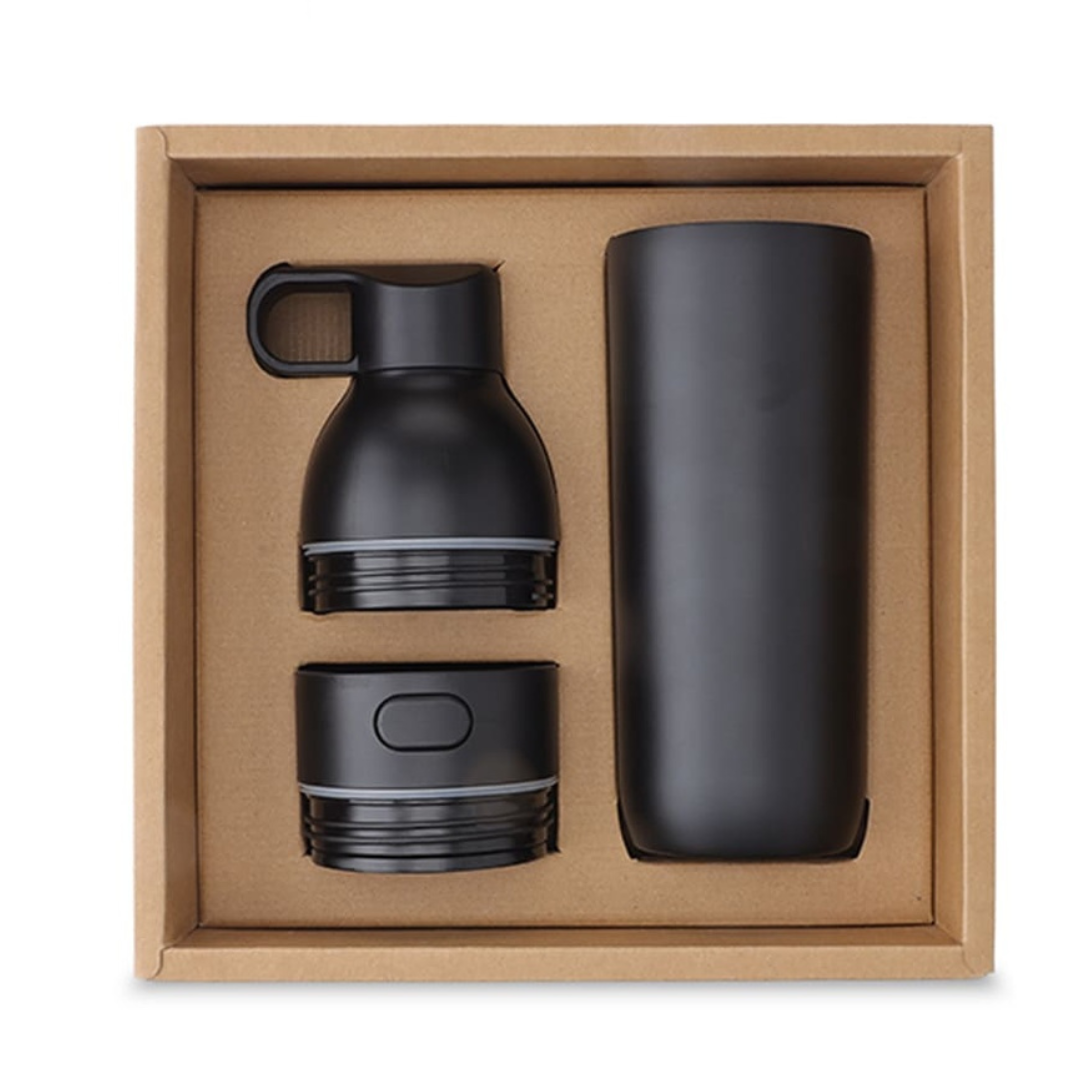 A modular hydration set that pairs a stainless steel bottle and a tumbler in one package, finished in black. This set features double-walled insulation to keep beverages hot or cold and interchangeable lids for either bottle or tumbler use. The durable black finish and stylish design make it perfect for travel, office, school, event giveaways or corporate gifts.
