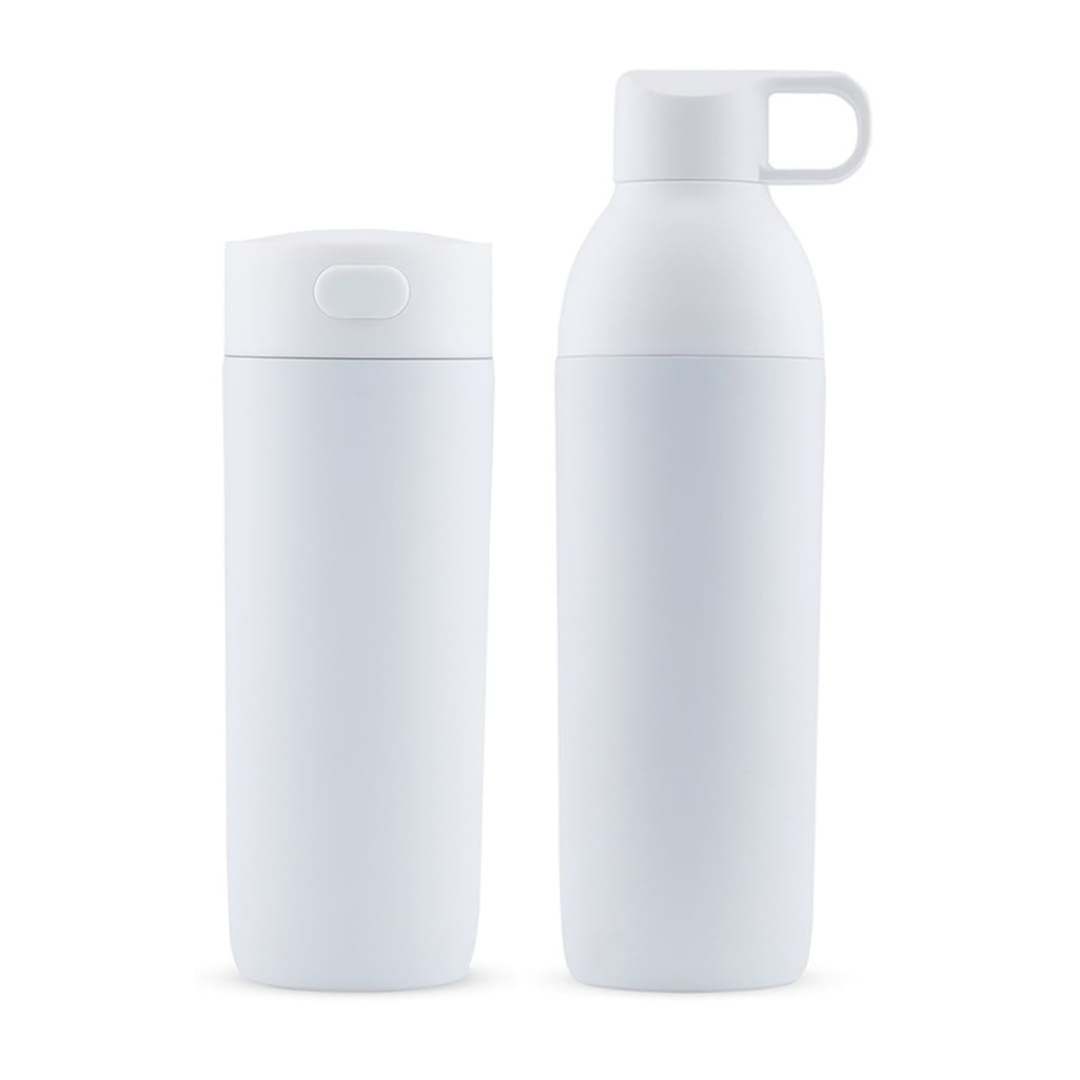 A modular hydration set featuring a water bottle and a tumbler bundled in one package, finished in white. The set is designed with double-walled stainless steel construction, insulated for hot or cold drinks, and includes interchangeable lids for both bottle and tumbler use. Its design makes it suitable for travel, office, school, events or gifting, and the package is compact for easy bulk ordering.
